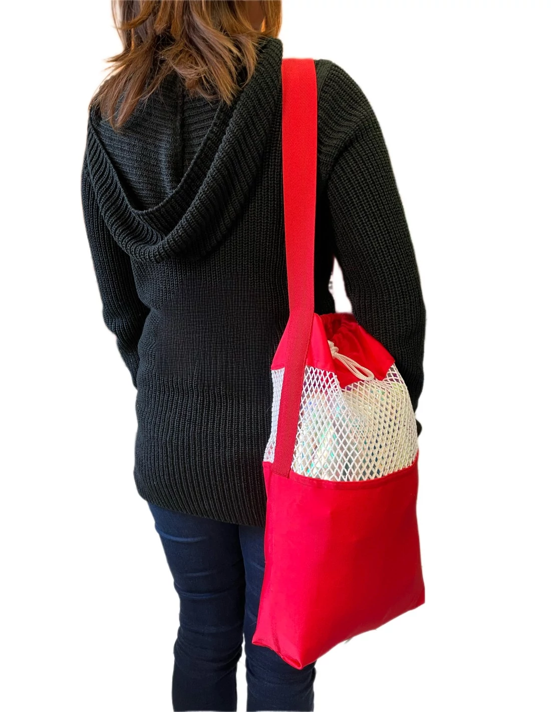 Pom-ponok tárolására és szállítására alkalmas táska. Színes, ellenálló lycra anyagból készült, vállpánttal és zsinóros záródással. A tetején található hálós anyag segíti a pom-ponok szellőzését.